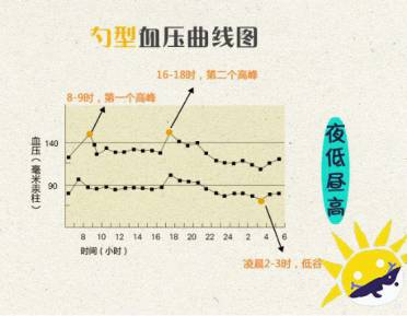 1、勺型血压:大部分人血压从早晨6:00开始逐渐升高,到10:00左右出现一个高峰,然后逐渐平稳下降,中午的血压相对较低,医学上把这种清晨血压急剧上升的现象称作晨峰血压。从14:00开始,血压再次逐渐升高,到16:00-18:00再次出现高峰(次高峰),然后缓慢下降;到凌晨0:00-2:00 血压达低谷,此后略有回升,并维持到6:00开始第二天的循环。全天的血压表现为双峰一谷的长柄勺型曲线,所以称勺型血压。