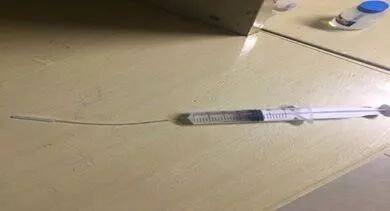 2、用60毫升的注射器,将2至3只开塞露抽吸到空针中