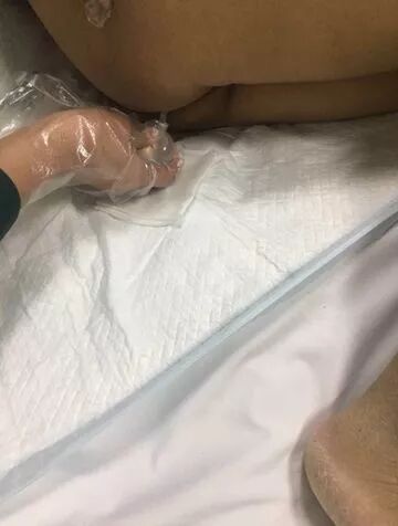 4、挤尽后,一手持纱布按摩肛门处,一手快速拔出开塞露外壳(成人一般需30~40ml).保持原体位十分钟左右。